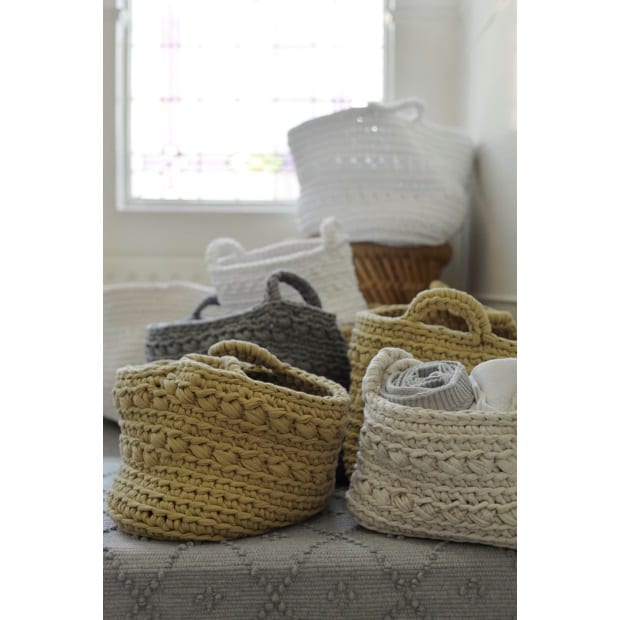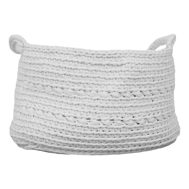Een steriele badkamer kan je warmte geven door gebruik te maken van verschillende materialen. Zoals met dit gehaakte mandje. Handig voor het opbergen van je badkamer spulletjes.