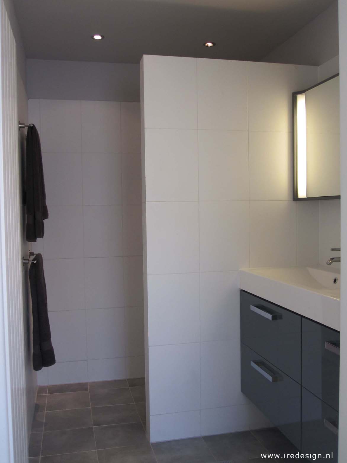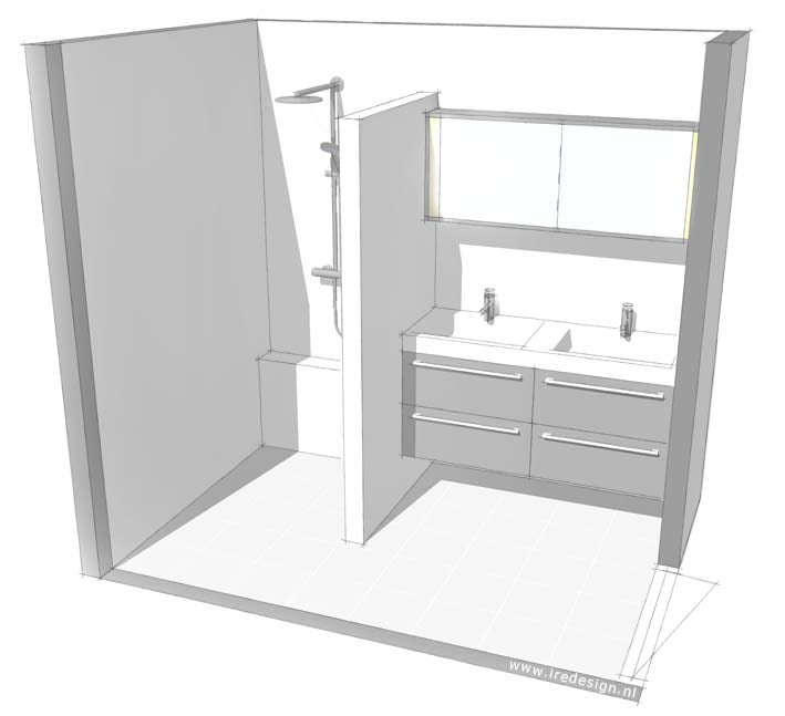 Bij een kleine badkamer is het vooral belangrijk om de ruimte zo optimaal mogelijk te benutten. Dat is hier gedaan door de wasmachine uit de badkamer te halen en met een nieuwe aansluiting in de berging te plaatsen. Daardoor is een tweepersoons wastafelmeubel van 1,4m breed nu wel te realiseren. Maak een duidelijke keuze, alles is nou eenmaal niet mogelijk. Wij hebben ervoor gekozen om het bad waar niet dagelijks gebruik van wordt gemaakt te vervangen door een grote inloopdouche.