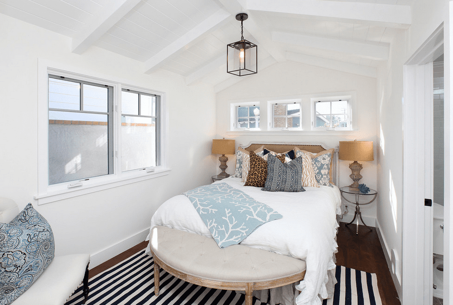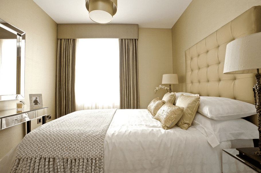Voldoende lichtinval voor een slaapkamer is erg belangrijk, maar voor je nachtrust is het wel fijn om deze ramen ‘s nachts te bedekken met gordijnen. Hoewel je dit misschien niet verwacht, zijn gordijnen in een kleine slaapkamer hartstikke multifunctioneel. De gordijnen zorgen niet alleen voor privacy en verduistering, maar kunnen de ruimte ook groter laten lijken. Kies in dit geval voor hoge gordijnen die lopen vanaf het plafond tot aan de grond. Hierdoor lijkt de kamer hoger, en dus groter.
