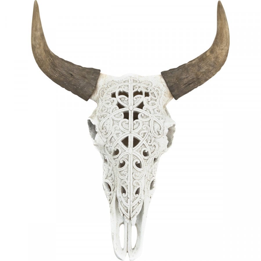 Niet iedereen is er enthousiast over, maar ik vind het een prachtige accessoire. Deze Ox skull is voorzien van sierlijke patronen en maakt hem een stuk vriendelijker.