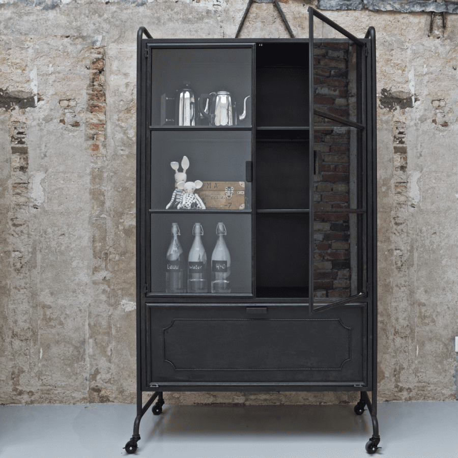 Deze stoere kast is gemaakt van metaal en staat op wieltjes. Ideaal om hem zo nu en dan een ander plekje te geven in huis.