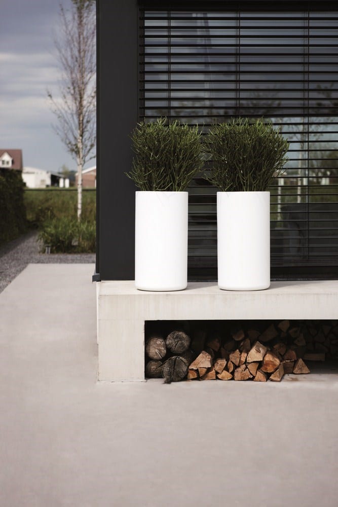 Moderne tuin met witte plantenbakken