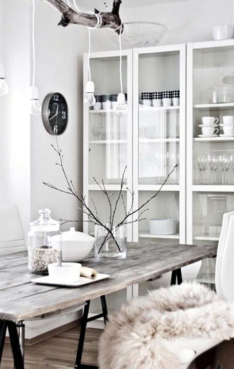 In de witte basis worden natuurlijke materialen en kleuren veelal aangevuld met grijze nuances en zwarte accenten. Soms met felle nuances maar merendeel met pasteltinten of vergrijsde tinten. Industriële invloeden kom je ook veel tegen en niet te vergeten veel grafische vormen en prints in de decoratie.